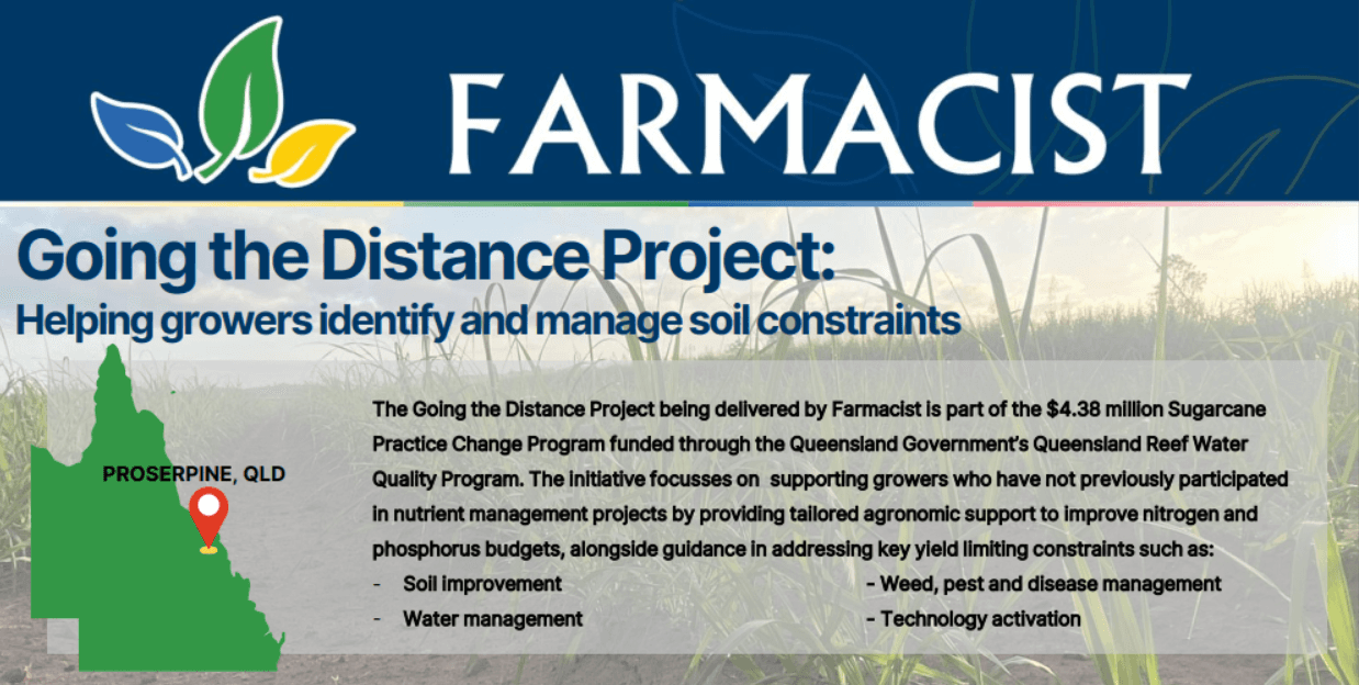 The Going the Distance Project being delivered by Farmacist is part of the $4.38 million Sugarcane Practice Change Program funded through the Queensland Government's Queensland Reef Water Quality Program. The initiative focusses on supporting growers who have not previously participated in nutrient management projects by providing tailored agronomic support to improve nitrogen and phosphorus budgets, alongside guidance in addressing key yield limiting constraints such as: