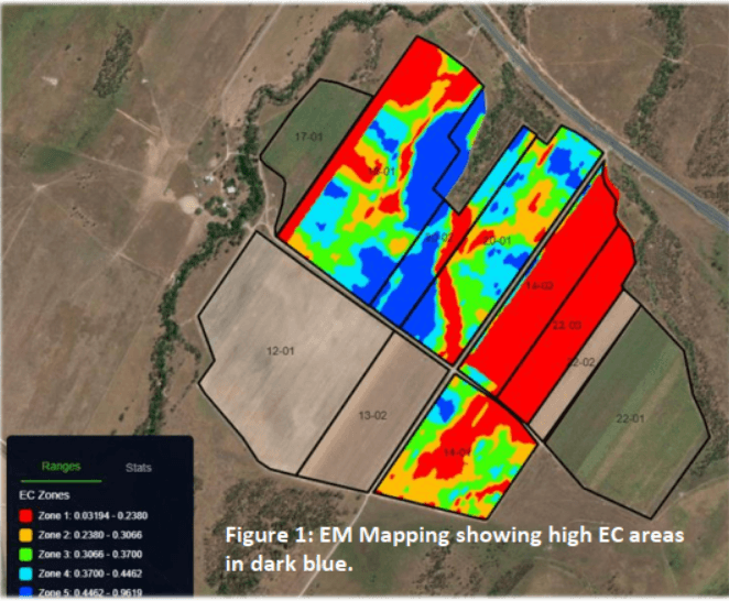 Brendan and Daisy had previously undertaken EM (electromagnetic) soil mapping on a portion of their property with the aim of identifying potential sodic 'hot spots'. A soil is considered sodic when the sodium ion concentration is greater than or equal to 6% of the total concentration of salts present in the soil (measured as an ESP[%]). Sodium ions attach to clay particles, causing them to disperse when wet. This results in sealing and crusting of the soil surface and a dense subsoil which resists root and water penetration.