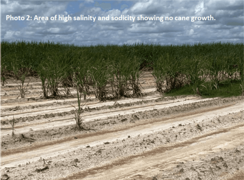 The EM mapping highlighted a number of areas within existing cane blocks as having high EC readings. Soil testing of these areas identified high sodicity and in some cases high salinity as major issues affecting productivity. Saline soils have a high concentration of soluble salts in the soil solution (the degree of salinity is measured by Electrical Conductivity [EC]). These salts can be a combination of a number of ions but sodium chloride is the most common. Salinity restricts growth by reducing the amount of water available to the plant.